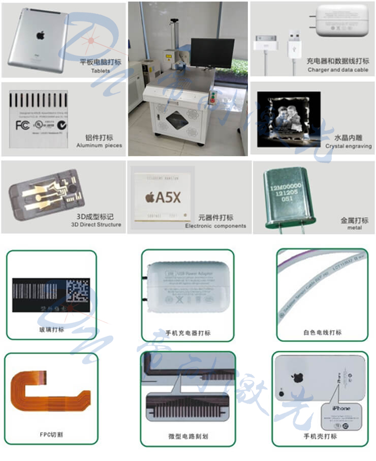 廣泛應(yīng)用于LCD液晶玻璃,LED基片,藍(lán)寶石基片,半導(dǎo)體晶圓,F(xiàn)PC柔性電路板,消費(fèi)類(lèi)電子產(chǎn)品,手機(jī)部件,陶瓷等的二維碼以及數(shù)字字母精細(xì)打標(biāo),ITO刻膜等行業(yè)。